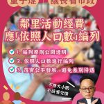 鄰里活動經費應公平透明,童子瑋推動「依人口數」編列原則。