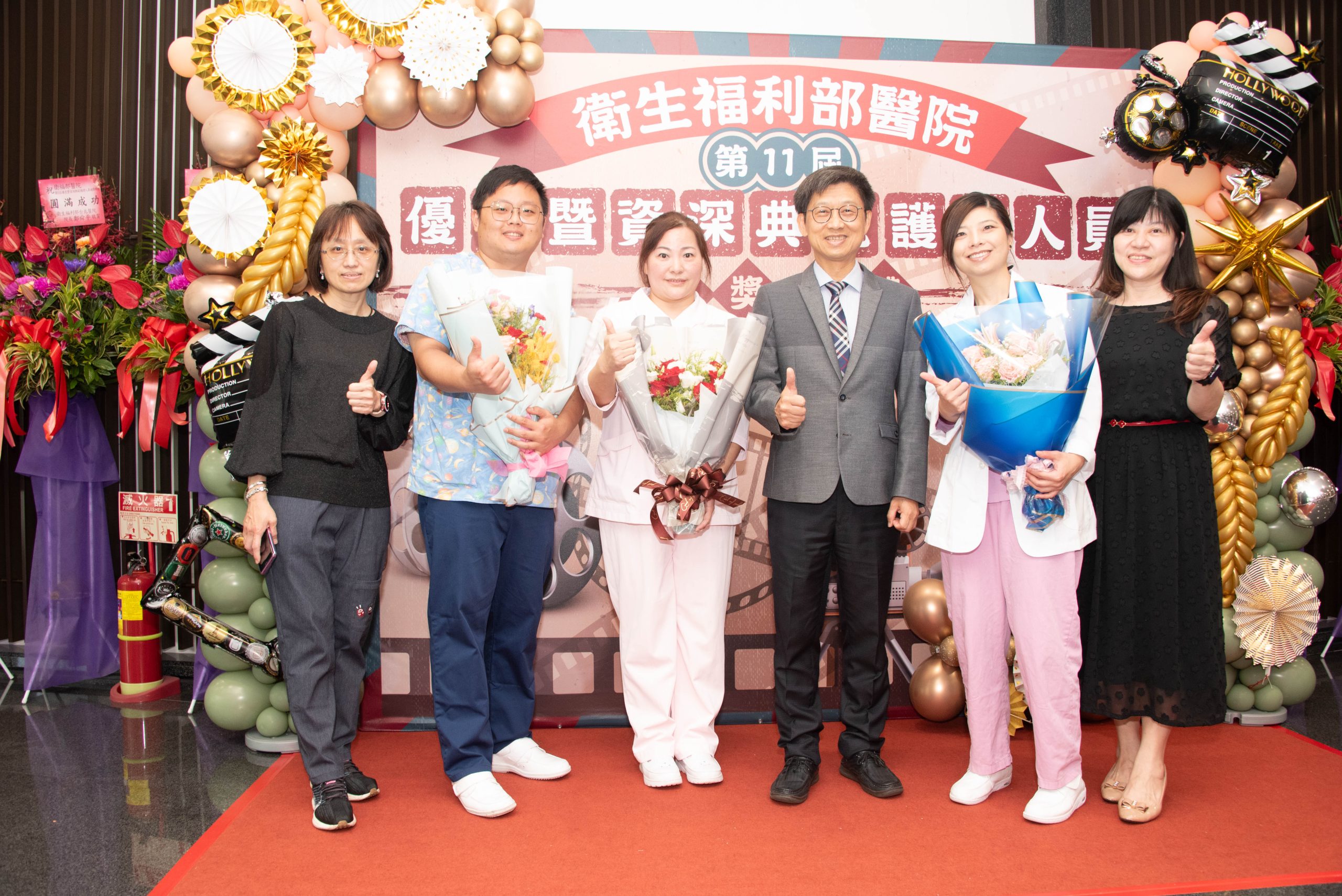 基隆醫院3名護理人員獲頒第11屆優良暨資深典範護理人員獎,薛瑞元部長公開表揚,(左起)何玉梅護理長、張惟淳護理師、于聖平護理長、林凰玉護理長,林三齊院長、護理科姚文真主任到場祝賀。(基隆醫院提供)