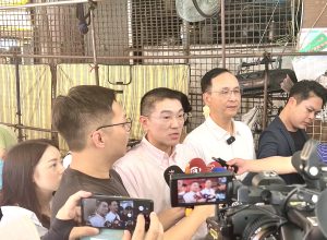 朱立倫主席和謝國樑市長造訪仁愛市場,改在上樓階梯左角處簡短受訪。(記者李伯元攝)