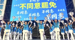 用「不同意罷免」圓扇,隨「台灣進行曲」舞動,提醒大家務必出來投票,效果甚宏(記者李伯元攝)