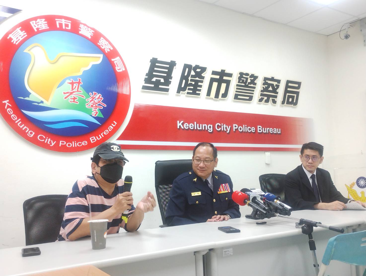 基隆市警察局召開「打詐成果記者會」,由局長林信雄(圖中)主持及市民現身說法。(市警局提供)