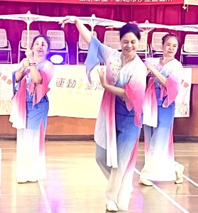 來自基隆的中華民國土風舞教師學會理事長廖宛民、楊淑樺老師和蘇麗英、鄭美淑,各班隊指導老師楊淑鈴、林姚蓁等和代表台灣體育總會土風舞協會的我,一起在台上帶動全場「我們都是一家人」在全場舞動中,展開各項表演,圓滿成功。