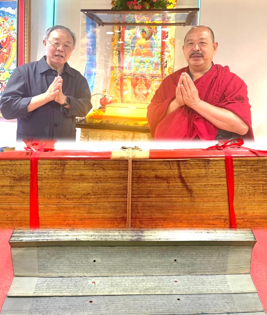 嘎檔文化節開幕,張炳煌教授 (左) 代表石漢基先生家族,隆重呈獻緬文巴利大藏經「貝葉經」,由慧吉祥大活佛 (右) 珍藏。(記者柳芬馨翻攝)
