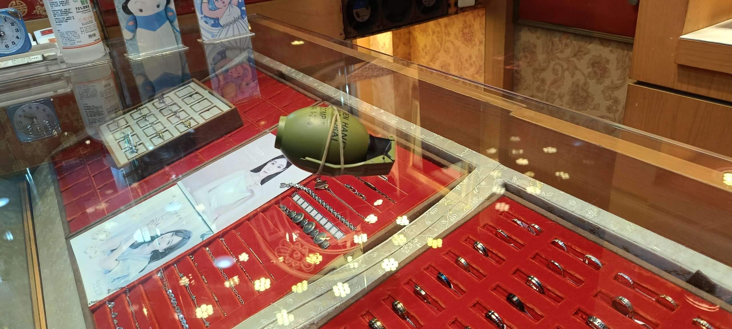 搶嫌戴男在現場店內櫃檯遺留一顆「華膠手榴彈」(記者張毅攝)