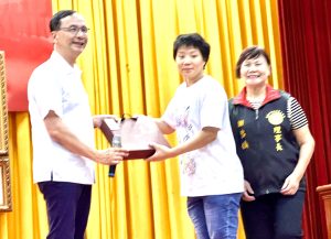 朱立倫主席贈禮給基隆障礙協會。(記者李伯元攝)