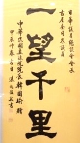 韓國瑜院長以張炳煌所書的「一望千里」隸書送給日本日華議員懇談會會長古屋奎司眾議員。(記者李伯元翻攝)