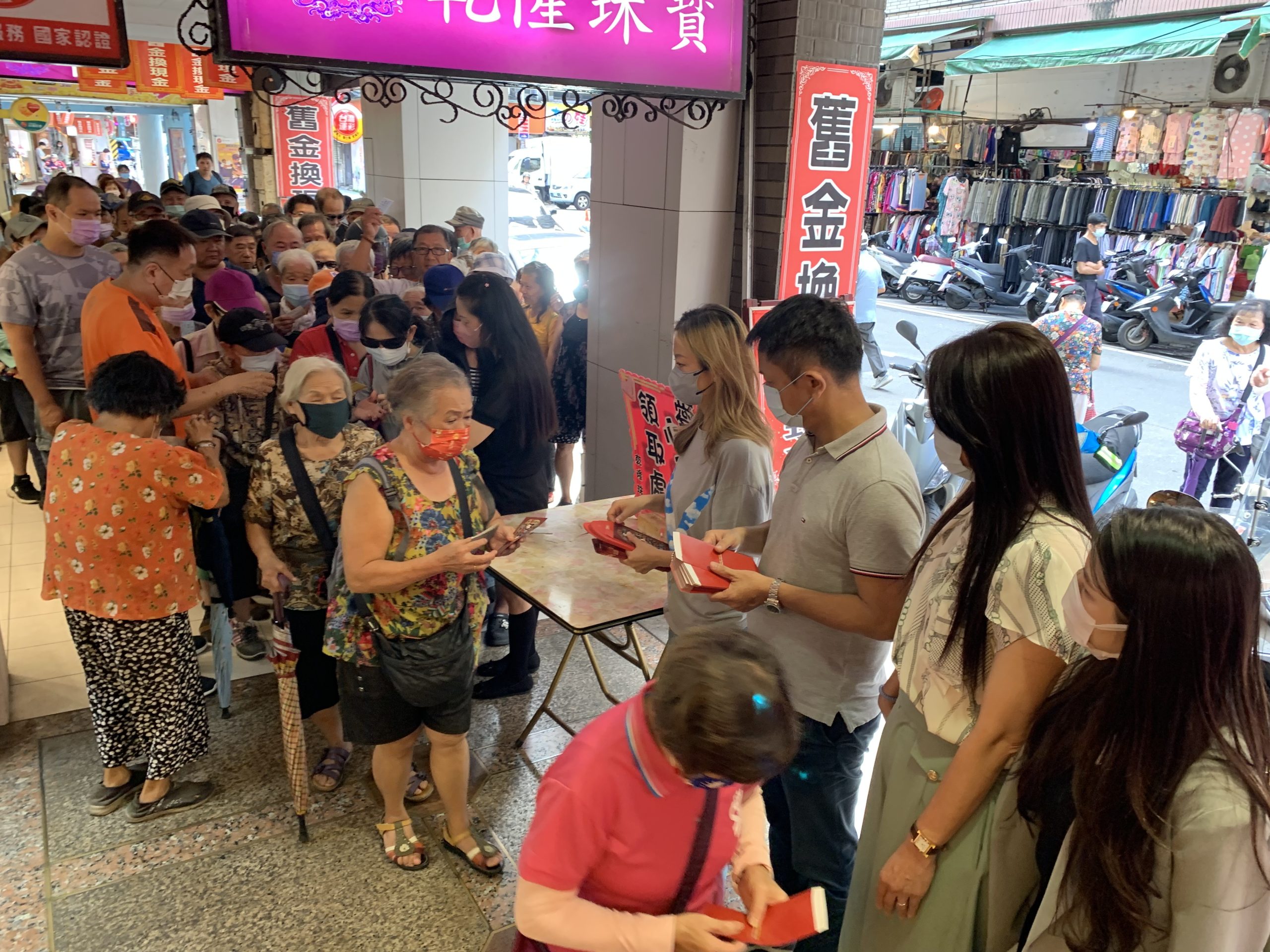 乾隆珠寶公司發放紅包大排長龍。(記者江宏志攝)
