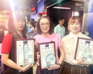 左起土風舞三姐妹;盧采伶、蘇麗華、江虹宜分獲優秀運動員,績優班隊和有功人員獎獎狀及獎牌。(記者李伯元攝)