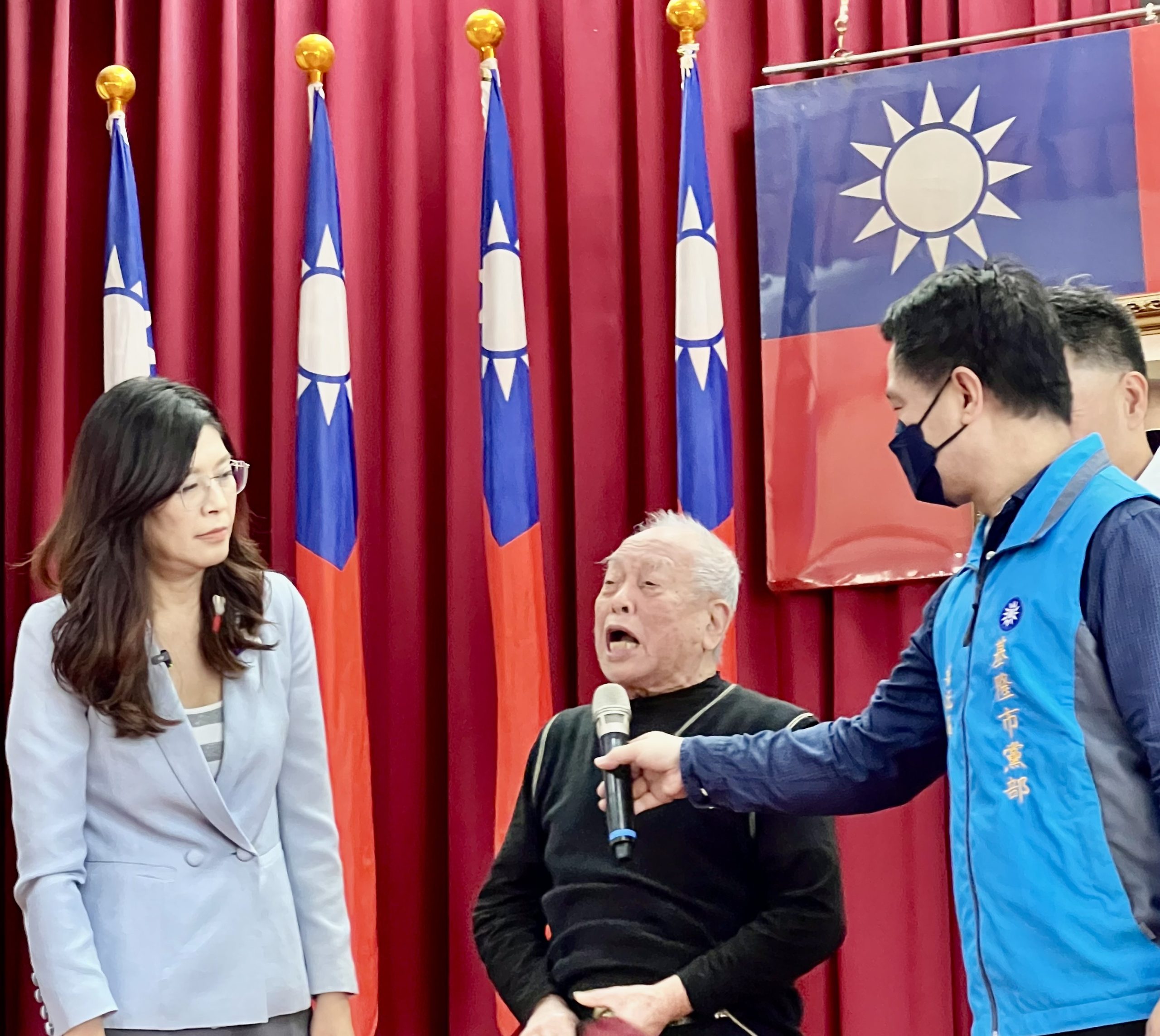 103歲的吳威融老先生上台,向鄭麗文主席,當面讚揚,書記長李銘議連忙拿麥克風給吳老暢所欲言(記者李伯元攝)