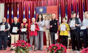 鄭麗文主席和謝國樑市長(中)和受獎資深黨員合影留念(記者李伯元攝)