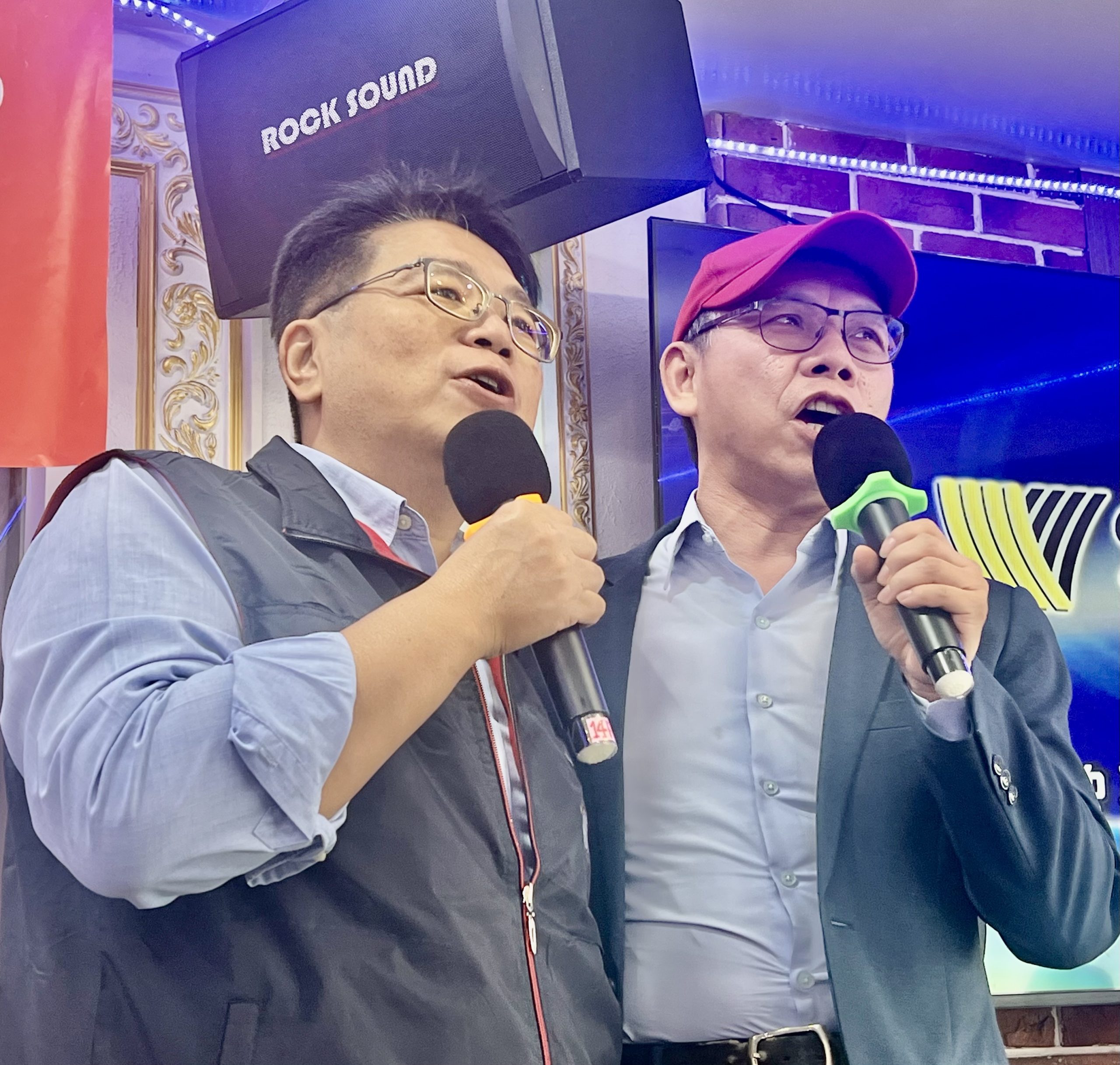 基中校友會理事長蔡智潁(左)和黃慎學及羅智强立委基中同班同學,在理監事會中歡迎校友回娘家參加百年慶(記者李伯元攝)