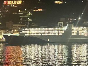 西岸「K EE LUN G」霓虹燈下,輪船和港面燈光閃爍。(記者李伯元攝)